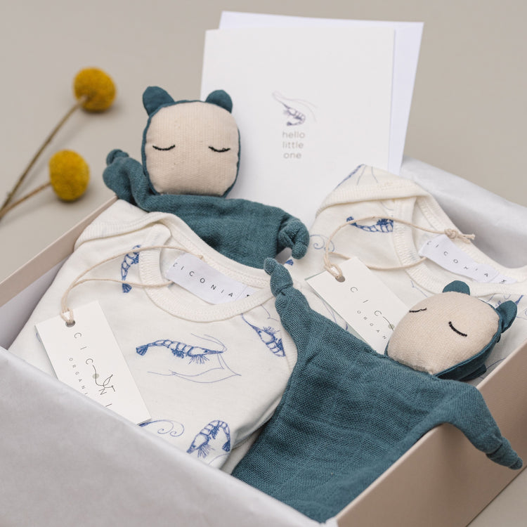 With a hint of your chosen blue shrimp print - a beautiful, in-house designed twin card (blank inside) will accompany your gift box. Don't forget to add your special message at checkout and we will do the rest! Sustainably sourced, carbon-neutral.