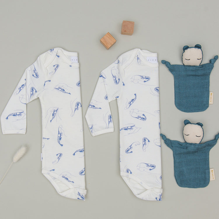 Matching delicate, soft-touch, long-sleeved bodysuits in our distinctive blue shrimp print over an ivory base. Breathable organic cotton protects even the most sensitive skin. Scratch mitts on 0-3M only. 100% GOTS certified organic cotton, nickel-free fastenings.