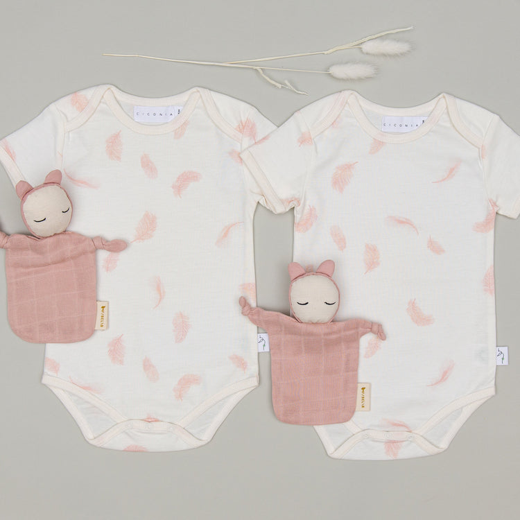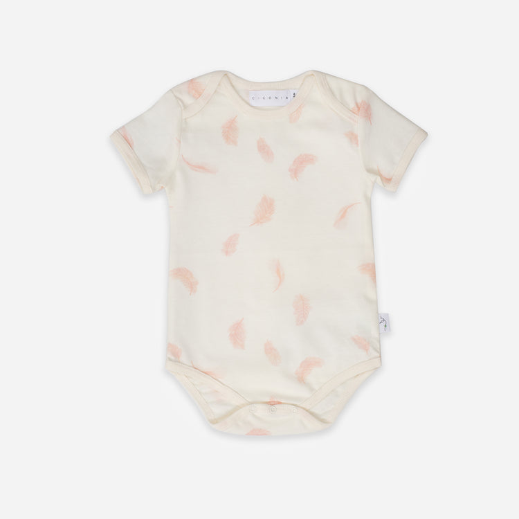 Matching brushed, short-sleeved bodysuits adorned with our delicate falling feather print over an ivory base. Breathable, soft organic cotton for comfort and kindness. 100% GOTS certified organic cotton, nickel-free fastenings.